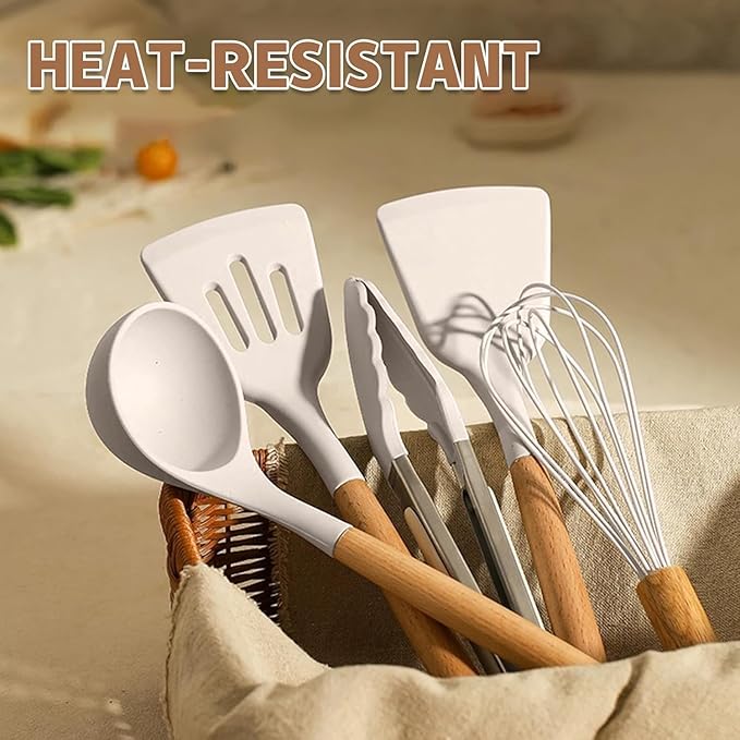 Umite Chef Kitchen Cooking Utensils Set, 33 pcs Non-Stick Silicone Cooking Kitchen Utensils Spatula Set with Holder, Wooden Handle Silicone Kitchen Gadgets Utensil Set (Khaki)